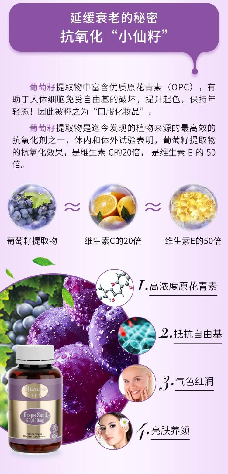 HEALTH LIFE海斯康宝超级红葡萄籽60000精华90粒-保质期2026年7月