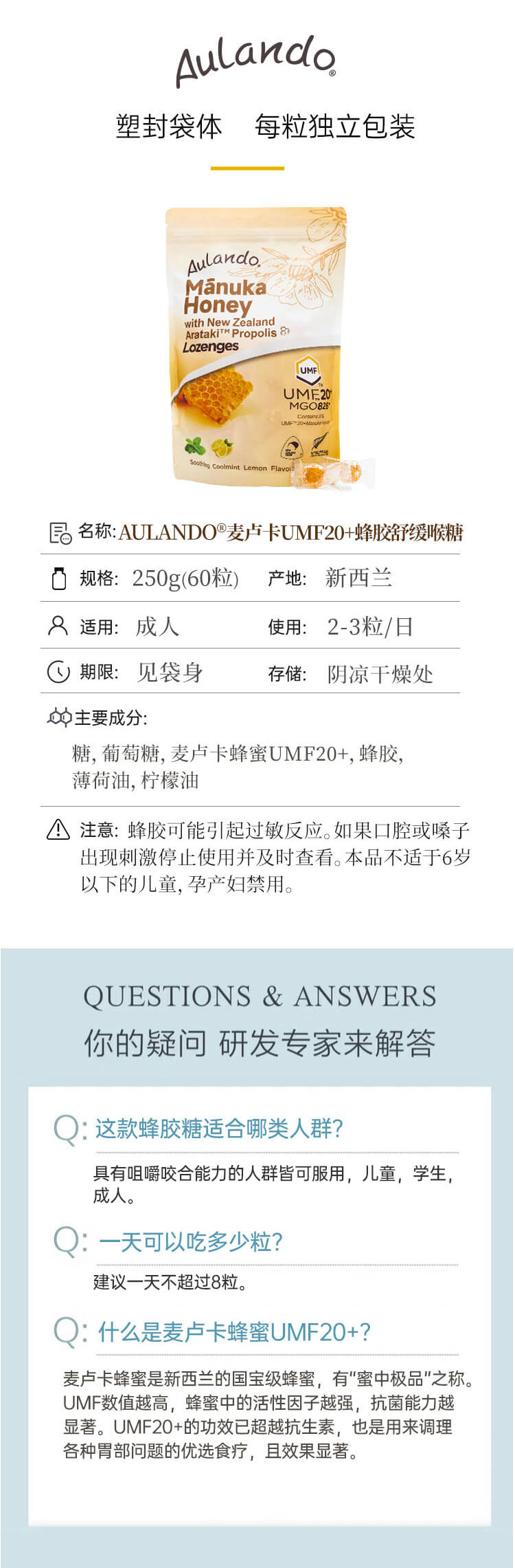 Aulando 欧兰多 UMF20+蜂胶抗炎舒缓喉糖250g原味-保质期2027年9月