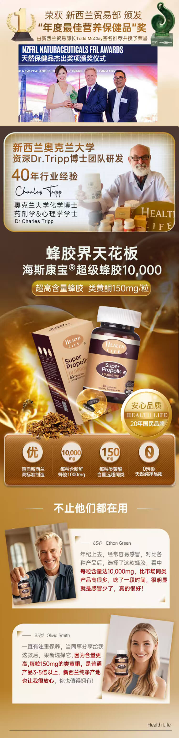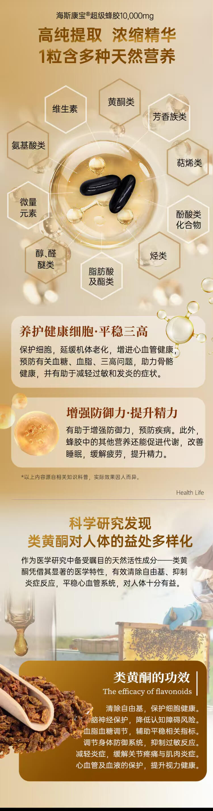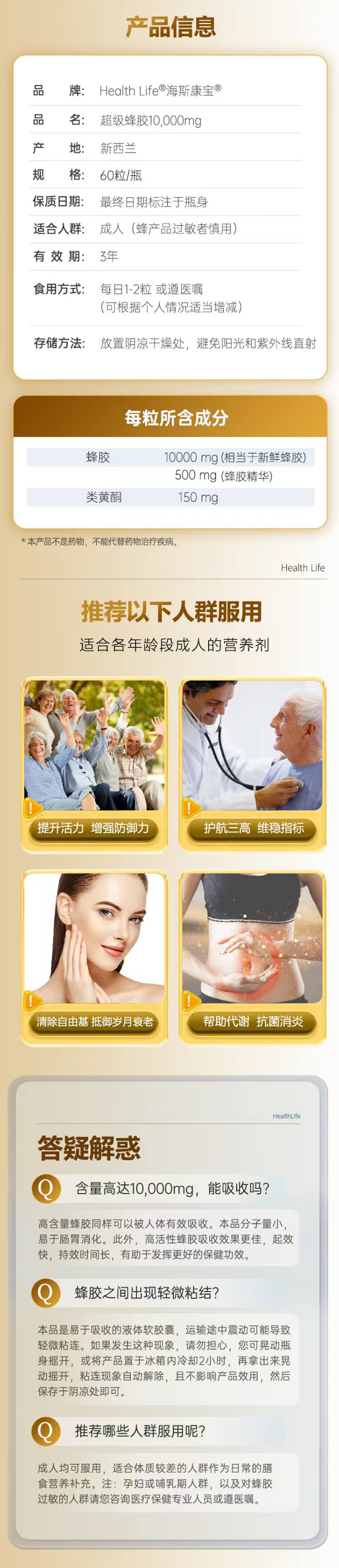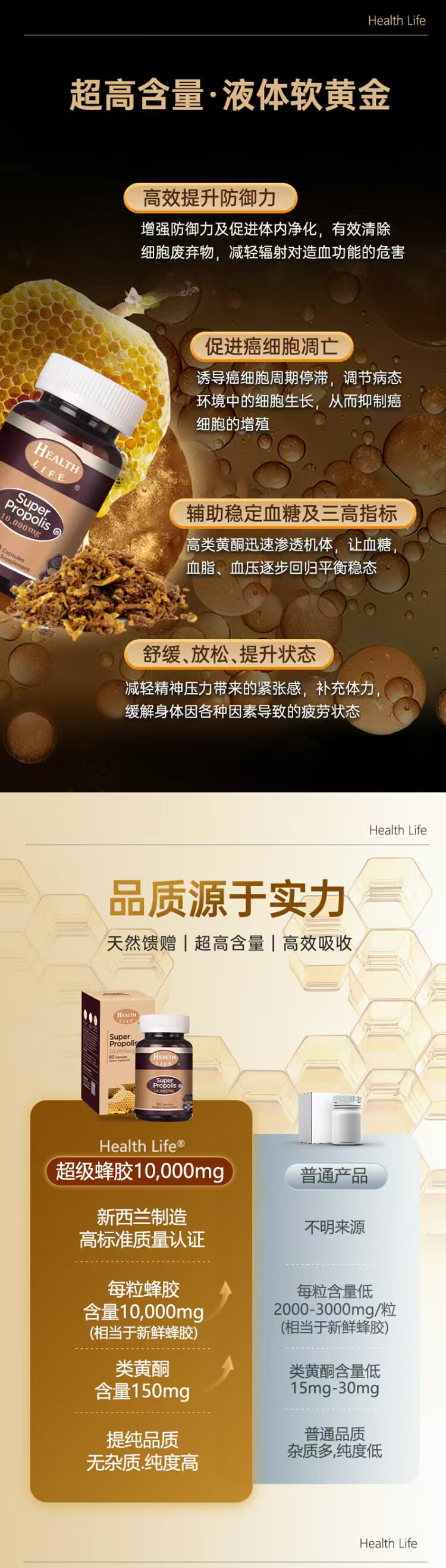 HEALTH LIFE海斯康宝超级蜂胶10000毫克 60粒-保质期2027年11月